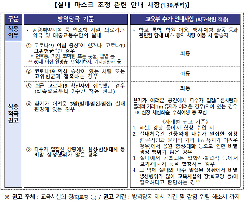 Q1. 학교(학원 포함) 실내 마스크 착용 의무가 어떻게 조정되는 것인지?